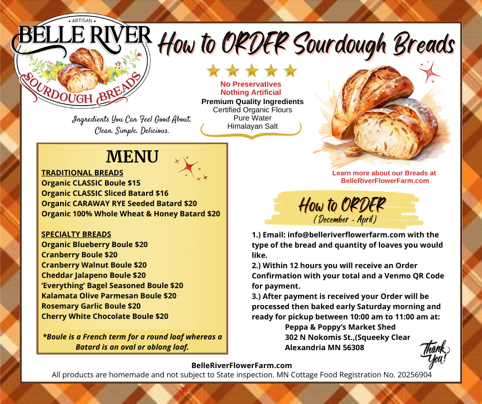 All “Belle River Flower Farm” Sourdough Breads and baked items are homemade and not subject to State inspection.